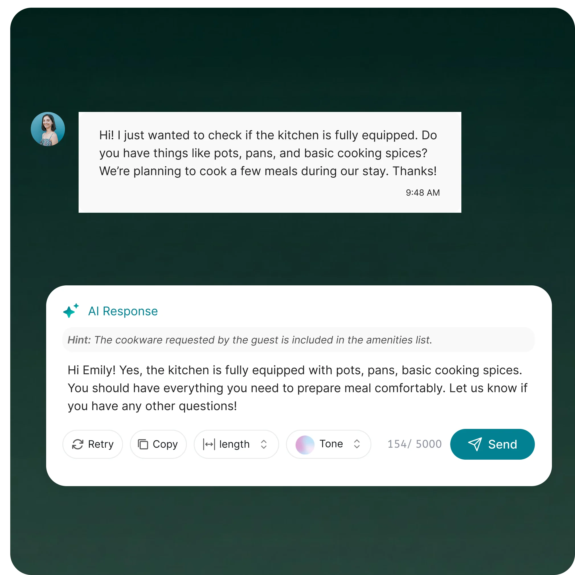 Never miss a guest message again with intelligent auto-responses and co-pilot suggestions that maintain your personal touch.